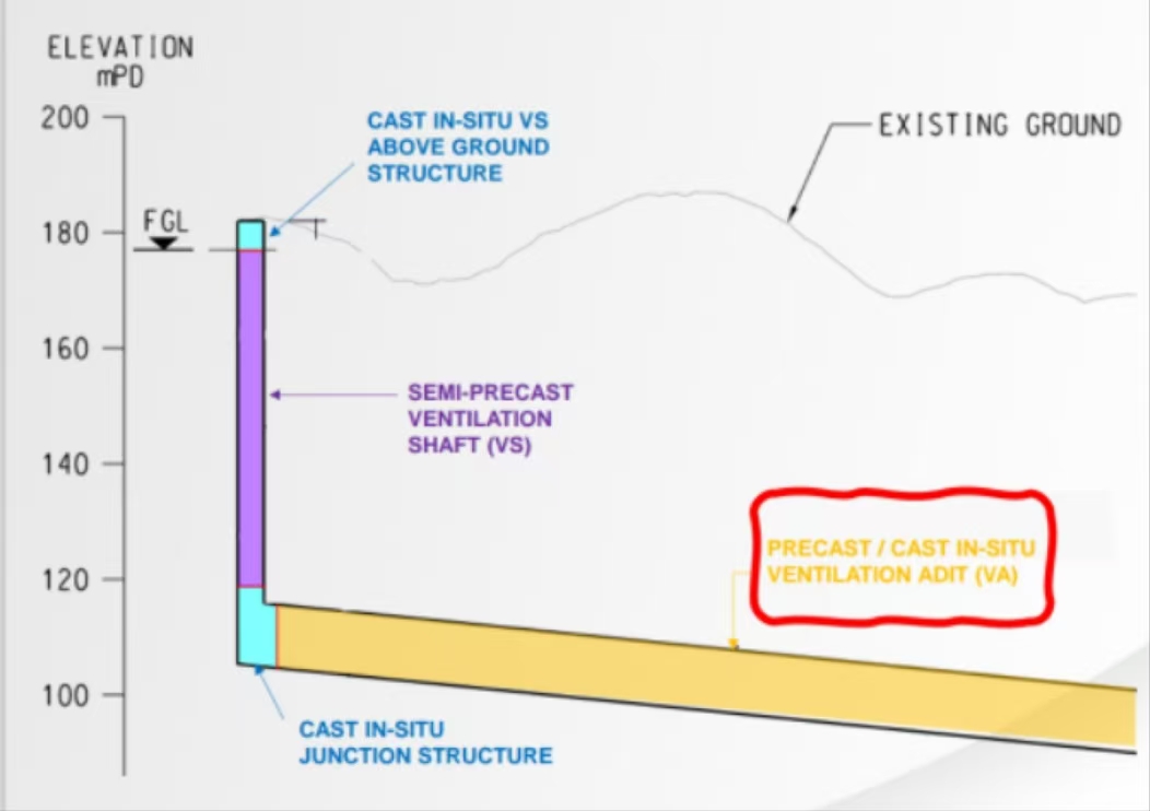 以 DC202005 項目為例,項目涉及預製通風井(SEMI-PRECAST VENTILATION SHAFT)與預製通風支洞(PRECAST VENTILATION ADIT)的複雜施工。匯通香港運用 DfMA 技術,在設計階段即整合構件製造標準與現場裝配需求,將通風井與支洞拆解為標準化預製構件。這些構件在工廠精準生產後,運至現場快速拼接,有效縮短了施工週期,同時確保構件安裝的精度與穩定性。